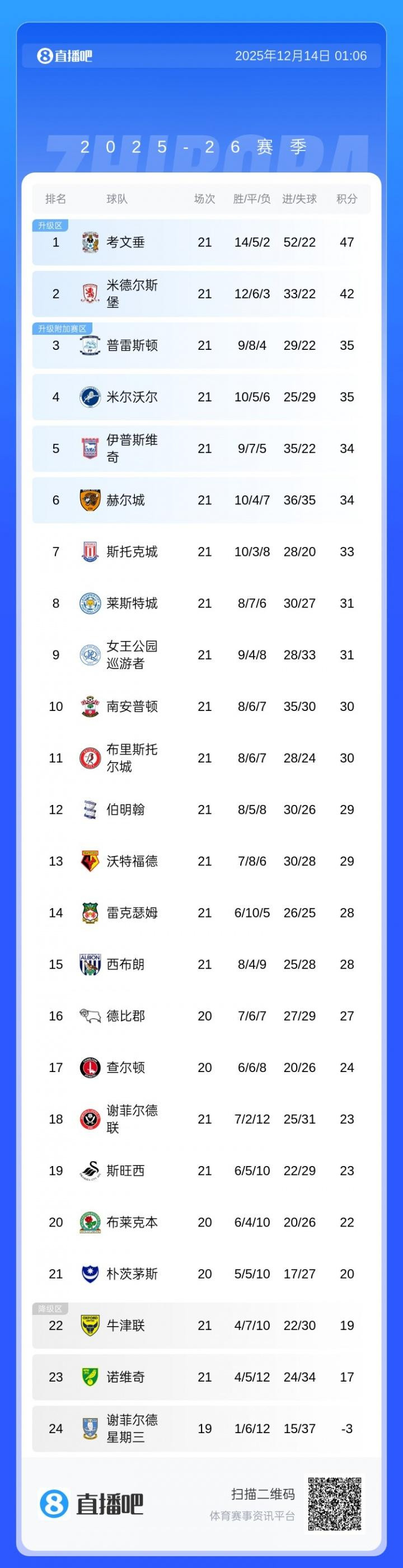 目前莱斯特城在英冠排名第8名,21轮后,他们距离升级附加赛区还有3分差距。